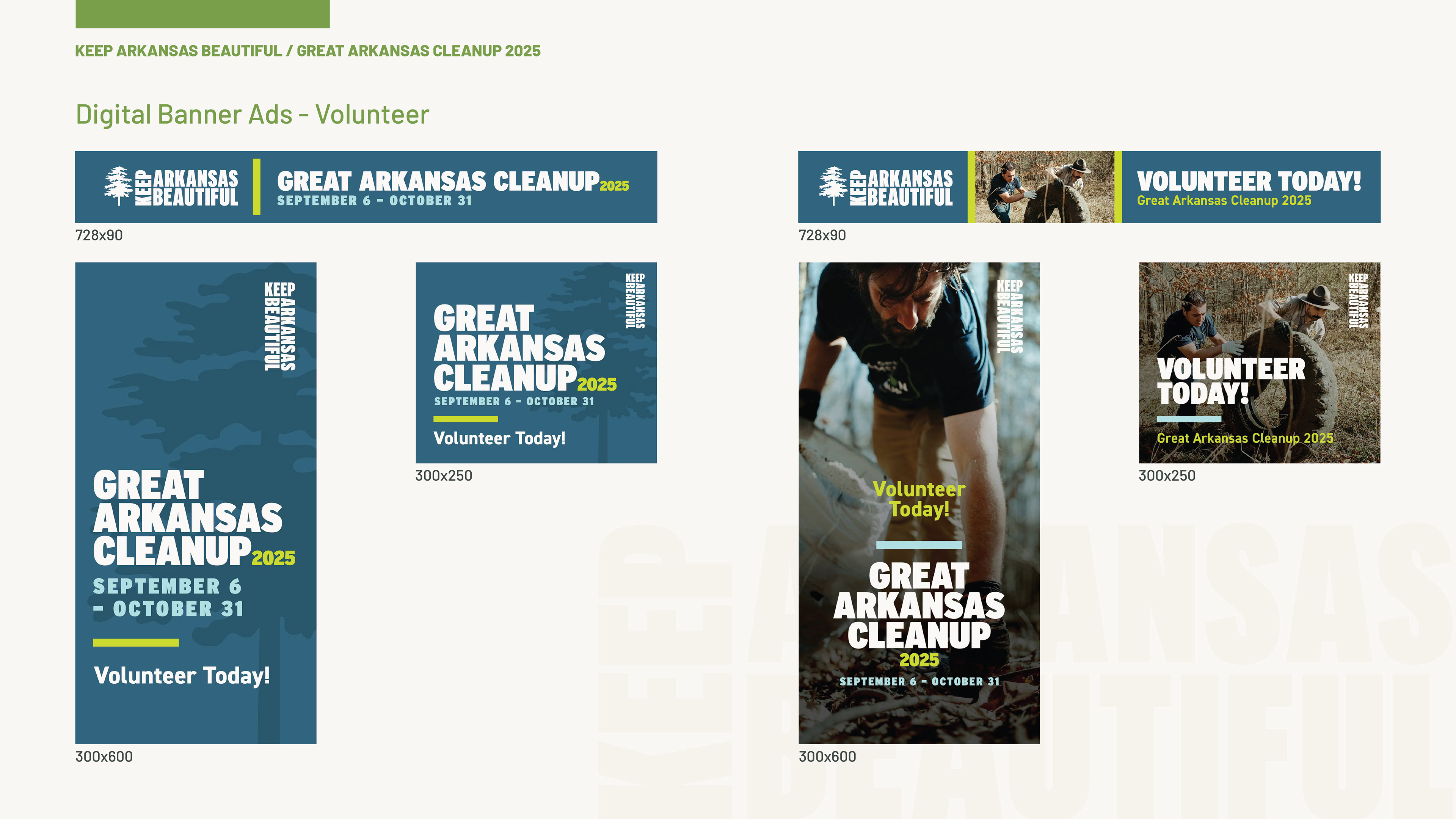 The Great Arkansas Cleanup is a cornerstone initiative within Keep Arkansas Beautiful’s statewide programs. Designed to inspire participation and pride, the campaign brings communities together to preserve the natural beauty of Arkansas. The print system captures the character of the landscape while encouraging collective action to keep the state clean.